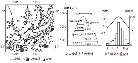 4、综合题 读“我国某地区地形图以及图中A山峰垂直自然带谱图和B点所在地区的气温降水月分布图”,回答下列问题:(12分)