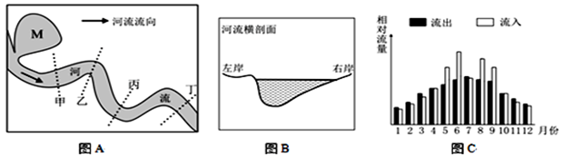 5、单选题 图A为某河段平面图,图B为图A中河流某处的河道横剖面,图C示意图A中M湖水量流入流出的月份分配。读图完成下列小题。