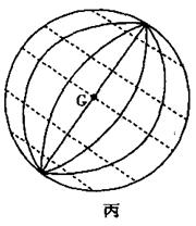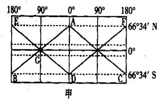 (3)在丙图中绘出当甲图DF为昏线时的光照情况(绘太阳光线、晨昏线,并用斜线标出夜半球)。