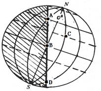 4、综合题 读“地球光照图”,图中阴影部分代表黑夜,回答问题。(10分)