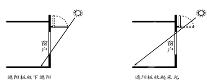 3、单选题  浙江某中学研究性学习小组,设计了可调节窗户遮阳板,实现教室良好的遮阳与采光。下图示意遮阳板设计原理,遮阳板收起,室内正午太阳光线照射的面积达一年最大值时(  )