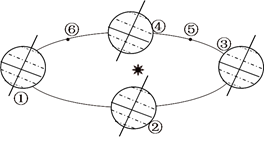 (4)在图中画出①位置时昼半球、夜半球的状况(用阴影部分表示夜半球)(2分)