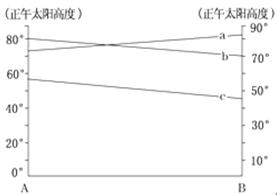 3、单选题 下图中的a、b、c分别表示地球上A、B两条纬线间北半球夏至日、春秋分日和冬至日时的正午太阳高度变化情况。读图,回答小题。