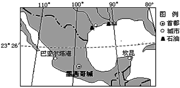 4、综合题  ? 2010年联合国气候大会于当地时间11月29日10时(区时),在墨西哥海滨城市坎昆举行。读墨西哥坎昆位置示意图,回答下列问题。