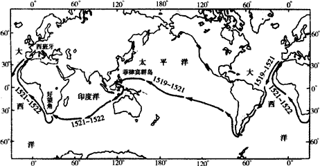 3、单选题  ? 1519年9月,葡萄牙航海家麦哲伦从西班牙出发向西做环球航行(参见下图)。1522年9月4日,幸存的十几名船员回到西班牙。据此完成1—2题。