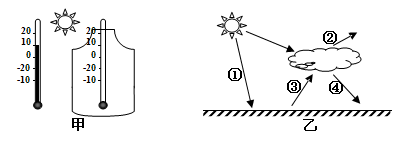 1.图甲为模拟温室效应的小实验,两支同样的温度计静置在阳光下,十分钟后,透明玻璃瓶内温度计的读数可能是2.图乙中与全球变暖相对应的大气热力作用是