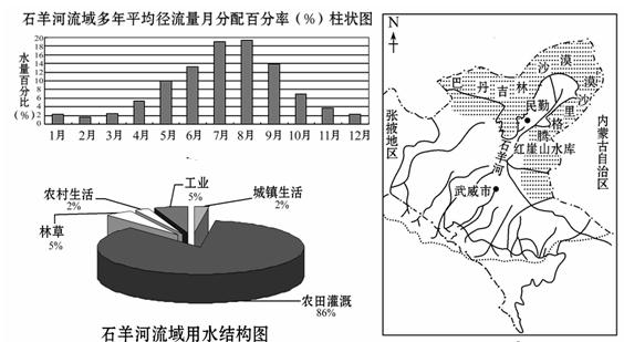材料二?石羊河流域示意图、石羊河流域多年平均径流量月分配百分率(%)柱状图、石羊河流域用水结构图。