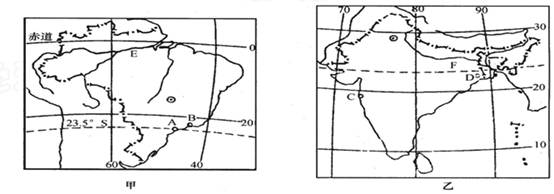 (1)乙?甲、乙两幅图的图幅大小相似,但乙图经纬线之间的间距比甲图小,实地距离短,所以比例尺大(3分)圣保罗、里约热内卢、盂买、加尔各答?加尔各答>孟买>里约热内卢>圣保罗或圣保罗<里约热内卢<孟买<加尔各答?