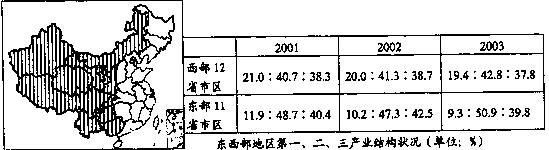 小题2:东、西部地区三大产业结构的共同特点是?所占比重最高,?所占比重最低。