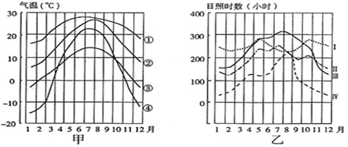 小题2:乙图中代表重庆、拉萨日照年变化的曲线是