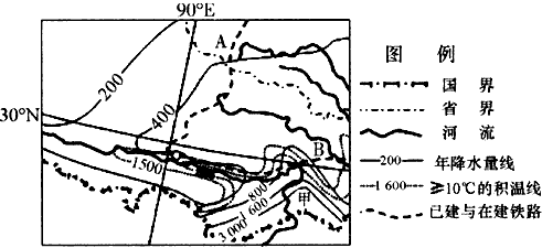下图是我国青藏高原局部地区年降水量、≥10℃的积温分布图。