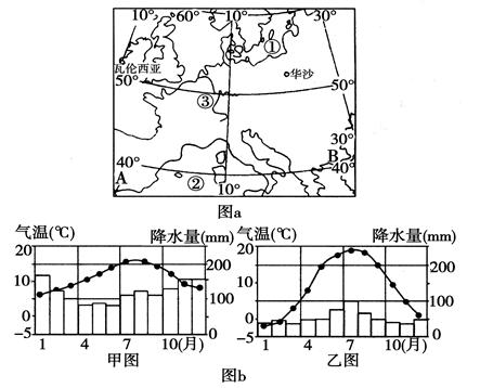 (1)读图a,瓦伦西亚欧洲西部沿海,属于温带海洋性气候,受西风和北大西洋暖流影响,终年温和湿润。华沙 距离海洋远,气候的大陆性强,冬夏温差大,所以乙是华沙。
