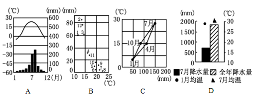 (4)下面能反应B地所示地区气候特征的是( )(2分)