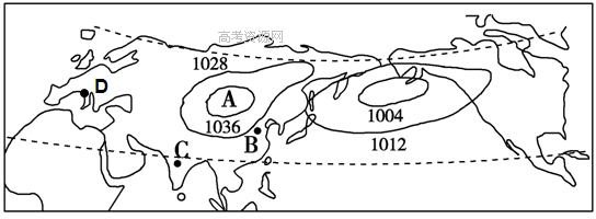 (2)此季节太平洋低空等压面向________(填“高空”或“近地面”)凸出,亚欧大陆上等温线向________凸出,图中D处此时的气候特征为 (4分)