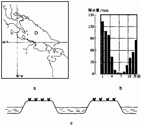 D湖泊(图a)的湖面海拔约3800采,降水资料如图b所示。D湖沿岸地区地形平坦。发现有大量古代农耕遗迹,包括相互交织的人工堆土高台、人工水渠(图c),以及人工运河和水塘。