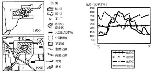 2、单选题 左下图是某城市1966 ~ 1996年发展示意图,读下面两幅图,回答题。
