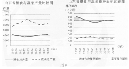 ?(1)据材料一中的图文资料,说明从1999年到2008年以来山东省粮食和蔬菜的总产量和播种面积分别有怎样的变化?并由此进一步分析引起这种变化的原因有哪些?(15分)