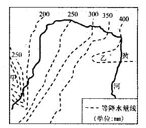 1.甲、乙两地降水量的差值可能是2.甲处附近等降水量线密集的原因是