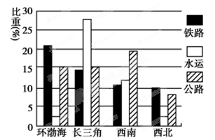2、单选题 读“我国长三角、环渤海、西北地区和西南地区三种货运方式占全国的比重(%)示意图”。完成以下问题。