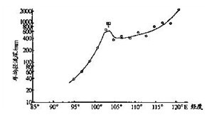 2、单选题  下图为中国部分区域多年平均径流深【径流深R,指计算时段内的径流总量平铺在水文测站以上流域面积上所得的水层厚度,它的常用单位为毫米(mm).若时段为△t(s),平均流量为Q(m3/s),流域面积为A(km2),则径流深R(mm)由下式计算:R=Q△t/(1000A)。平均径流深则为径流深的多年平均值】1随经度的变化示意图,图中选取的是沿台湾—江西—四川—青海等省一线水文观测站(图中小圆点)以上流域面积的数据.回答问题。