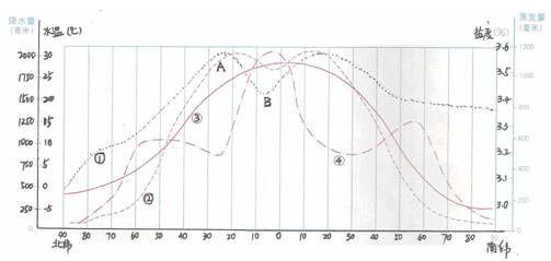 (1).图中代表海洋表层盐度、年降水量、海洋表面平均温度、蒸发量按纬度分布曲线的数字代号分别是 ????