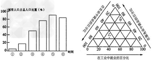 5、单选题 下图为某城市“城市人口占总人口比重变化图”和“劳动力在各行业中的百分比图”,读图回答1-2 题。