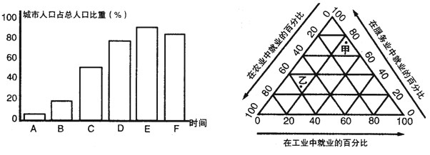 2、右图中甲、乙表示不同城市化阶段的就业比重状况,其中乙较合理的处在图甲中的