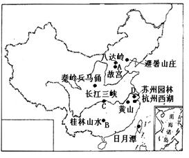 ①长江三峡 ②北京香山红叶 ③拉萨布达拉宫 ④黄山云海 ⑤藏族晒佛节 ⑥日月潭 ⑦敦煌莫高窟壁画彩塑