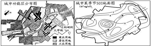 1.城市功能区分布图中,Q地为该城市规划预留地,最适宜建2.该城市大气SO2地面浓度最大的区域,其污染物来源可能是