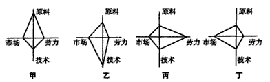2、单选题 下图是工业区位选择模式图,其中线段长短表示影响程度大小。下列情况与甲、乙、丙、丁四图相符的是