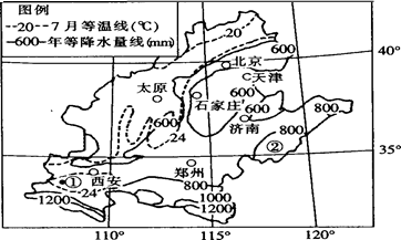 小题1:图中等差距为4°C,太原与石家庄温差在0°C-8°C之间,那么其最大值应大于4°C;①处位于秦岭北侧山地,气温低于24°C;西安和郑州的降水量位于600mm和800mm之间,因郑州距海洋近,降水应多于西安;而太原、石家庄的年降水均小于600mm。故选D。