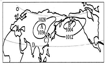 本题解析:解答本题的关键是依据图中等压线分布状况正确判断亚欧大陆与太平洋上的气压分布差异。由图示可判断A为亚欧大陆,B为太平洋。