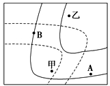 小题2:根据题意,乙处气压低于甲处,则图中的实线等压线,左边的等压线(用a表示)气压高,右边的等压线(用b表示)气压低;A地位于两条等压线之间,A地气压大于b小于a,B地位于a等压线上,B地气压等于b,所以A地气压较低,B地气压较高,A选项错误,B选项错误;根据等压线的弯曲,凸高为低,可得出图示所画的弯曲处为低压槽,形成锋面为冷锋,A地处于暖气团那一侧,B地处于冷气团那一侧,锋面附近阴雨天气往往出现于冷气团那一侧,所以A出现降水的概率较小,B处可能出现阴雨天气,D项正确。
