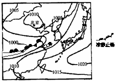 小题3:根据图中等压线分布可知,北京的气压1010-1015hpa,山东半岛气压1005-1010hpa。所以北京的气压比山东半岛大0—10hpa。选择A项。