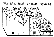 3、单选题 下图是石灰岩地形的发育图(由甲→丁)。请问:桂林、阳朔的地形最接近哪一时期?