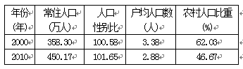 小题1:人口性别比变大是因为人们受传统的重男轻女思想观念影响,与自然增长率低无关,A错。根据材料数据,人口自然增长率为负增长,所以出生率低,常住人口的增长率较高不可能是因为出生率高,B错。户均人口数减少是因为计划生育政策的实施,C错。农村人口比重减小是因为外来人口主要流向城市,城市有更好的条件,D对。