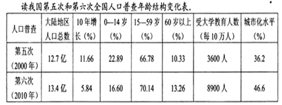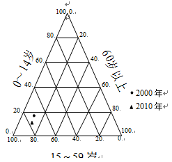 小题2:读图,2010年与2000年相比,0~14岁人口比重明显减小,但是不可减少幼儿教育经费投入,A错。15~59岁人口比重明显提高,说明劳动力人口增加,有利于劳动密集型产业发展,B对。60岁以上人口数量增加较少,不是最多,C错。经济水平高,医疗水平提高,人口平均年龄不可能下降,D错。
