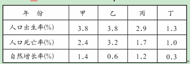 3、单选题  下表为某国历史上不同年份的人口出生率、死亡率和自然增长率。甲、乙、丙、丁四个年份人口变动的情况反映了人口增长模式的一般规律,据此回答。