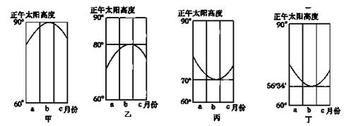 若a、b、c依次表示5、6、7三月,则甲、乙、丙、丁四地按照昼长从长到短的顺序为(?)