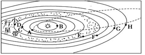 (1)图中根据小行星带的位置可知,E为木星,H在八大行星最外面,距离太阳最远,应该为海王星。