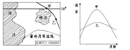 5、单选题 下图中图Ⅰ所示区域陆地地势平坦,图Ⅱ为图Ⅰ中河流甲、乙两处的年径流量曲线。读图回答下列各题。