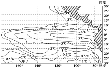 【小题3】图中等值线表示的是海水温度与正常年份海水温度的差值,图中甲处外围等值线为-2℃。说明海水温度比正常年份海水温度低2℃,根据等值线“大于大的,小于小的”原则可知,甲处海水温度比多年平均值低2℃以上。