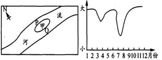 1、单选题 下左图为我国某河流河道示意图,甲为一河心沙洲,下右图为该沙洲一年内面积变化统计图,读图完成下列问题。