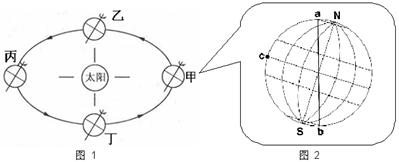 1、综合题 (12分)读二分二至日地球公转位置示意图(图1)和地球位于甲位置时昼夜状况图(图2),完成下列问题。