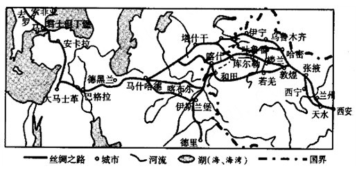 (1)古“丝绸之路”属于大型线形自然文化遗产,列举“丝绸之路”中国段沿线的著名文化旅游景观。(至少两项)(4分)