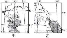 小题1:根据图示的经纬度位置和海陆轮廓判断,甲为里海周边地区,乙位于波斯湾沿岸,两地都为世界著名的石油、天然气资源产区。
