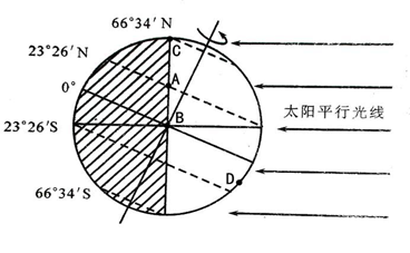 (3)太阳高度为太阳光线和地平面的夹角,昼半球太阳高度大于0°,夜半球小于0°,晨昏线上等于0°,正午太阳高度的计算公式为H=90°-纬度差(直射点和所求地点的纬度数之差)。据公式可计算出B点的H=90°-(23°26-0°)="66" °34′。任何一天,正午太阳高度的纬度分布规律是从直射点所在纬线向南北两侧递减,直射点所在纬线最大,离直射点所在纬线越近,H越大。