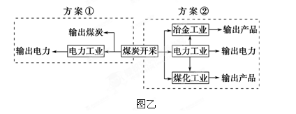 (2)为了加快黄河中游地区煤炭资源的开发和利用,把资源优势转化为经济优势,地方政府提出了下列两套方案(见图乙)。你认为哪套方案的经济效益更高?要保证煤炭资源的合理开发与区域可持续发展,还应注意采取哪些措施?(3分)