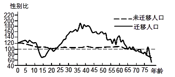 1.迁移人口中,男性人口比女性人口多50%以上,即在迁移人口中,性别比高于150%的年龄段,直接读图即可判断。