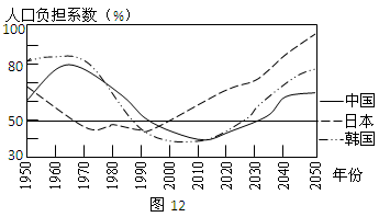 1、单选题 图12为中国、日本和韩国人口负担系数百年比较图【注:人口负担系数=(14岁及以下人口数+65岁及以上人口数)/(15岁~64岁人口数)100%】,回答下题。